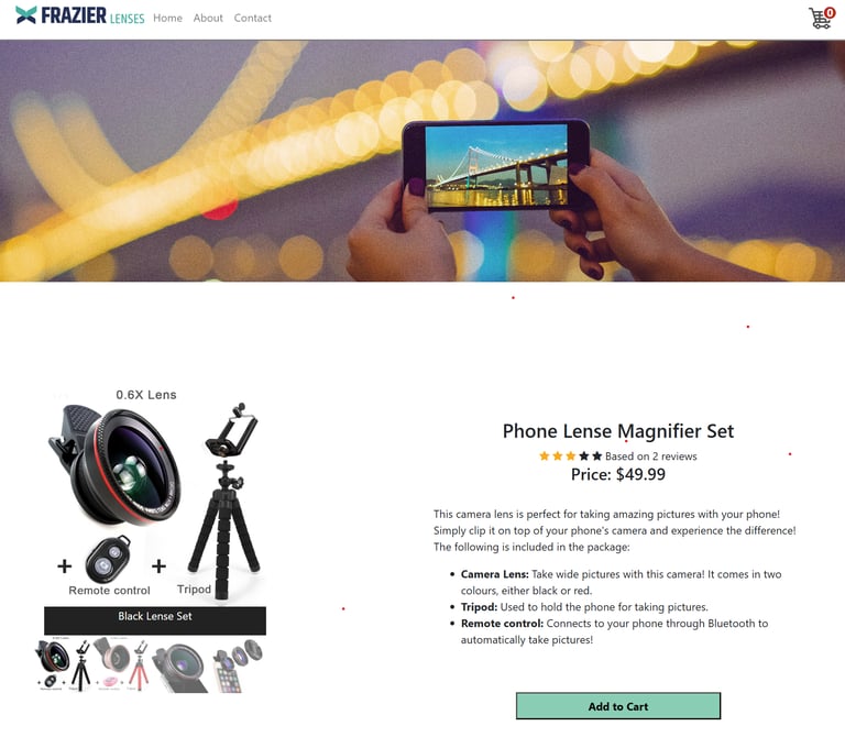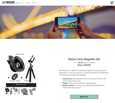 Frazier Lenses is a streamlined product page store application designed for a seamless shopping experience. It features a dynamic review section, allowing users to create, edit, and delete (CRUD) reviews for the product.