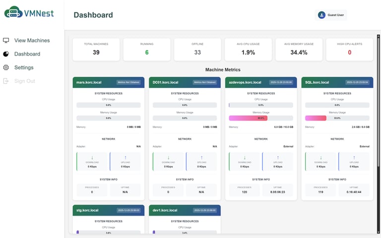 VMNest is designed to enhance the user experience of managing virtual machines by offering an intuitive platform for seamless interaction with existing VMs in any environment. Its primary goal is to enable users to monitor the performance of these machines through a comprehensive dashboard that displays various performance metrics.